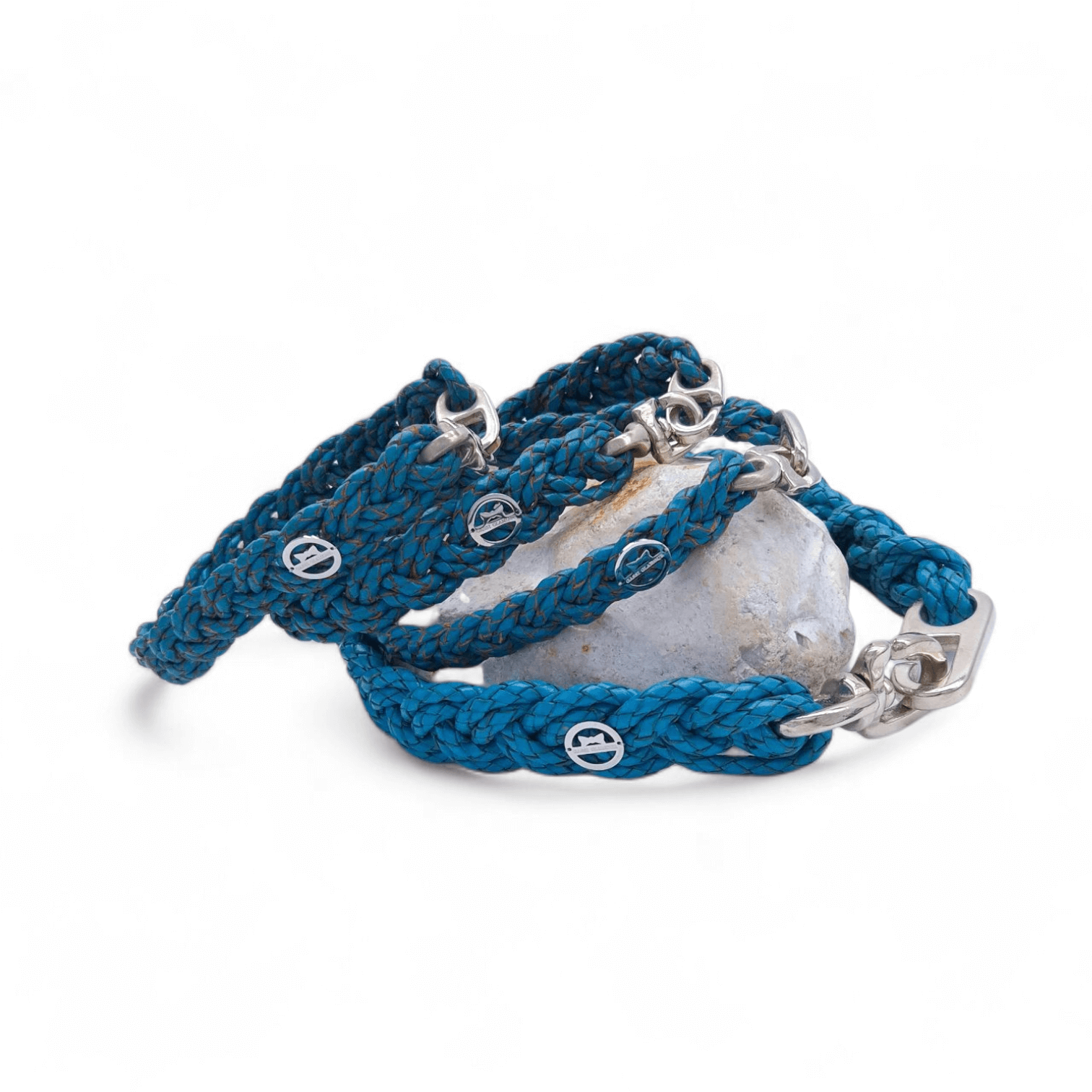 Flechthalsband aus feinen, in sich geflochtenen Lederbändern in leuchtendem "Capriblau" - silberfarbenen Brummelhaken aus dem Segelsport.
