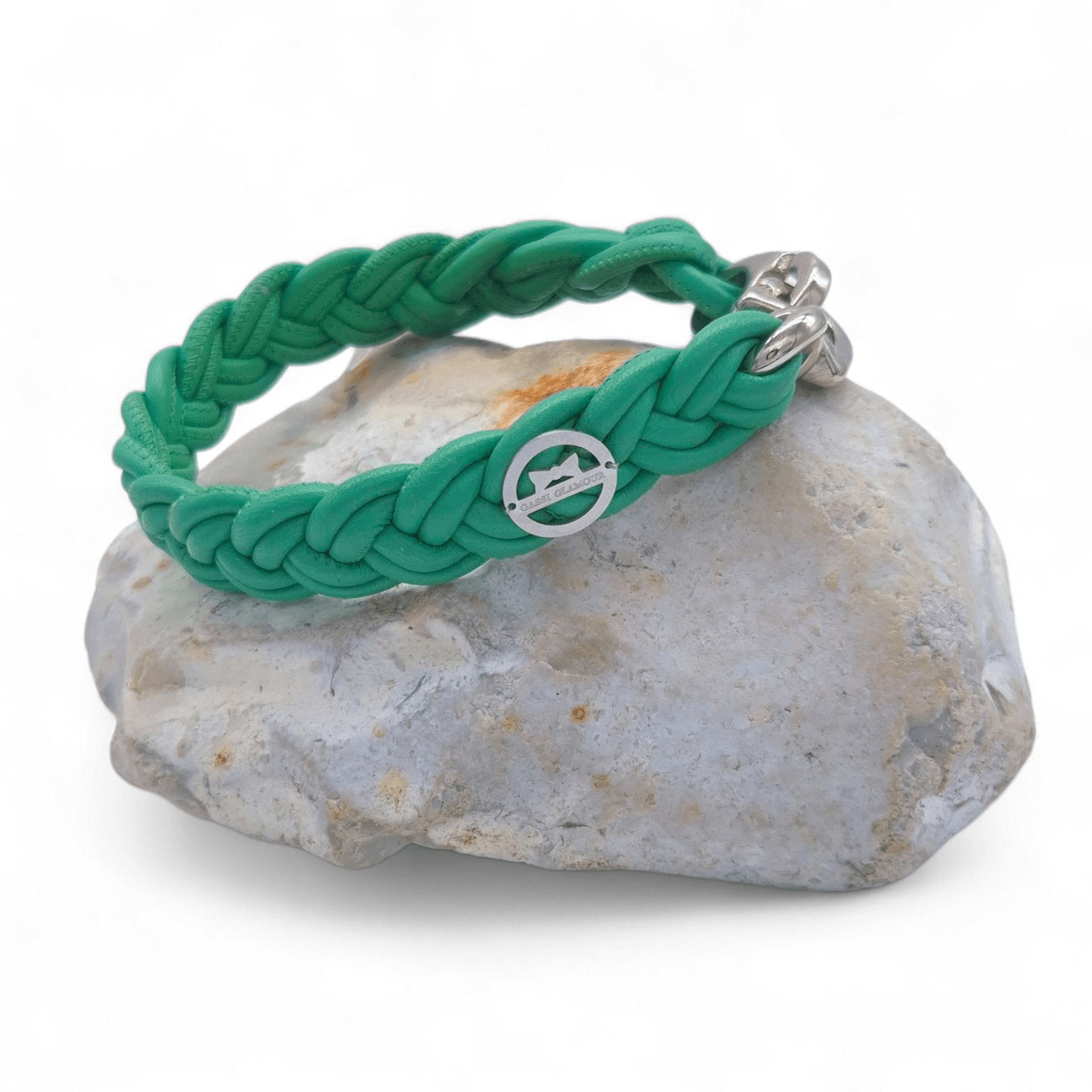 Flechthalsband aus feinstem, italienischem Nappaleder in edlem Jade - veredelt mit den stylischen Messing Brummelhaken aus dem Segelsport.